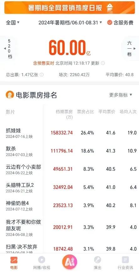 据网络平台实时数据,截至22日12时18分 ,2024年暑期档(6月—8月)档期总票房(含预售)突破60亿!《抓娃娃》《默杀》《云边有个小卖部》暂列档期票房榜前三位。