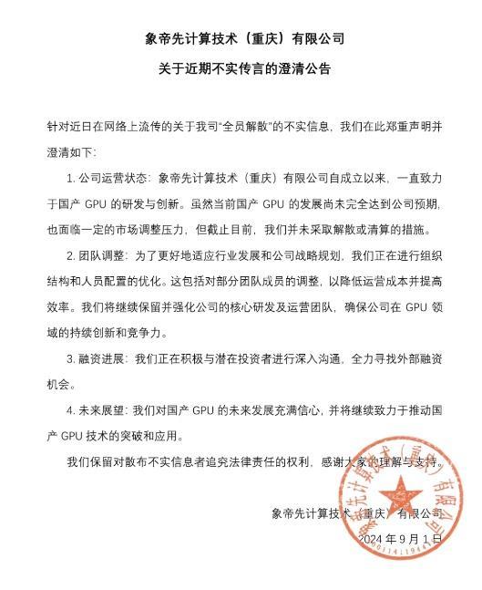 对此,象帝先公司官微发布“关于近期不实传言的澄清公告”,公司表示:目前未采取解散或清算措施,只是正在进行组织结构和人员配置优化,包括对部分团队成员的调整,以降本增效。